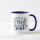 Esta taza muestra el himno cristiano titulado "Está bien con mi alma", cita Inspiradora en la escritura decorativa azul.