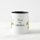 "LOVE MY AIREDALE" declara esta taza para el dueño del Perro Airedale Terrier. Cada lado de la taza tiene un hermoso retrato acuarela de un Airedale marrón enmarcado por flores de girasol y hojas verdes. Se mezclan en ellas brotes de eucalipto verde azul. Entre las dos imágenes está el texto, que puede ser fácilmente personalizado, o incluso eliminado, por usted.