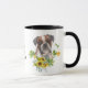 "LOVE MY BOXER" declara esta taza para el orgulloso dueño del perro Boxer. Cada lado de la taza tiene un hermoso retrato acuarela de un perro Boxer de color marrón y blanco enmarcado por flores de girasol y hojas verdes. Se mezclan en ellas brotes de eucalipto verde azul. Entre las dos imágenes está el texto, que puede ser fácilmente personalizado, o incluso eliminado, por usted.