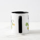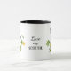 "LOVE MY SCOTTIE" declara esta taza para el orgulloso dueño de perro de Scottish Terrier. Cada lado de la taza tiene un hermoso retrato acuarela de un perro escocés enmarcado por flores de girasol y hojas verdes. Se mezclan en ellas brotes de eucalipto verde azul. Entre las dos imágenes está el texto, que puede ser fácilmente personalizado, o incluso eliminado, por usted.