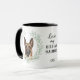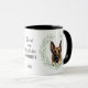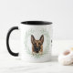 "LOVE MY BELGIAN MALINOIS" declares this mug for the proud Malinois dog owner. Each side of the mug has a beautiful portrait of a Belgian Malinois framed by soft green watercolor eucalyptus leaves. Between the two images is the text, which may be easily customized, or even removed by you, and your monogram or name.