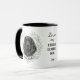 "LOVE MY COCKER SPANIEL DOG" declares this mug for the Spaniel dog owner. Each side of the mug has a watercolor portrait of a black American Cocker Spaniel framed by soft green watercolor eucalyptus leaves. Between the two images is the text, which may be easily customized, or even removed by you, and your monogram or name.