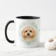 "LOVE MY COCKAPOO DOG" declares this mug for the Cockapoo dog owner. Each side of the mug has an adorable portrait of a buff colored Cockapoo framed by soft green watercolor eucalyptus leaves. Between the two images is the text, which may be easily customized, or even removed by you, and your monogram or name.