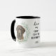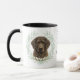 "LOVE MY CURLY COATED RETRIEVER" declares this mug for the Curly Coated Retriever dog owner. Each side of the mug has a beautiful portrait of a chocolate brown Retriever framed by soft green watercolor eucalyptus leaves. Between the two images is the text, which may be easily customized, or even removed by you, and your monogram or name.