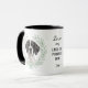 "LOVE MY ENGLISH POINTER DOG" declares this mug for the Pointer dog owner. Each side of the mug has a watercolor portrait of a black and white Pointer framed by soft green watercolor eucalyptus leaves. Between the two images is the text, which may be easily customized, or even removed by you, and your monogram or name.
