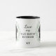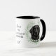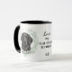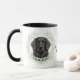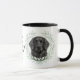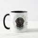 "LOVE MY FLAT COATED RETRIEVER" declares this mug for the Retriever dog owner. Each side of the mug has a portrait of a beautiful black Flat Coated Retriever framed by soft green watercolor eucalyptus leaves. Between the two images is the text, which may be easily customized, or even removed by you, and your monogram or name.