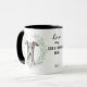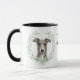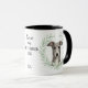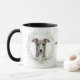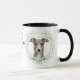 "LOVE MY GREYHOUND DOG" declares this mug for the hound owner. Each side of the mug has a portrait of a beautiful gray Greyhound dog framed by soft green watercolor eucalyptus leaves. Between the two images is the text, which may be easily customized, or even removed by you, and your monogram or name.