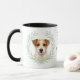 "LOVE MY JACK RUSSELL TERRIER" declares this mug for the Terrier dog owner. Each side of the mug has a portrait of a beautiful little Jack Russell Terrier framed by soft green watercolor eucalyptus leaves. Between the two images is the text, which may be easily customized, or even removed by you, and your monogram or name.