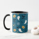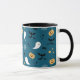 Una taza de café con fantasmas de Halloween, calabazas, telarañas y murciélagos sobre un fondo azul oscuro.