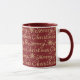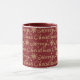 Esta taza está decorada con papel pintado a mano con letras doradas de Feliz Navidad, estrellas y copos de nieve sobre un fondo de color rojo acuático.