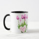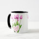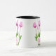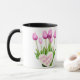 Pink Tulip Bouquet Happy Mother's Day Mug Esta taza de café de cerámica presenta un hermoso diseño de tulipanes rosados con un mensaje "Happy Mother's Day" escrito dentro de una forma cardíaca. Es un regalo perfecto y asequible para mamá para mostrar su aprecio en el Día de la Madre. Diseño: tazón floral, tazón ramo, tazón rosado.