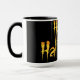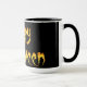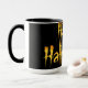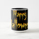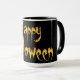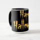 Guay con aspecto de naranja y amarillo Happy Halloween texto con un fondo negro. Diversión y taza de café decorativa para celebrar la fiesta.