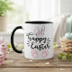 Esta taza de dos tonalidades presenta orejas de conejito rosa y pies conejitos con las palabras "Feliz Pascua" en un guión decorativo negro.