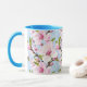Una taza combo adornada con delicadas ramas de flor de cerezo en suaves tonos rosados y verdes sobre un fondo azul sereno, que aporta un toque elegante y calmante al café o té de la mañana. Una elección refinada y lista para regalar para amantes de la naturaleza y fans del diseño floral elegante.