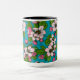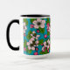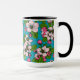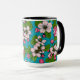 Flores de manzana dibujadas a mano y abejas con un fondo turquesa