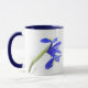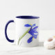 Una fotografía de una flor del iris púrpura y amarillo contra un fondo blanco.