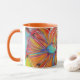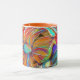 El diseño digital de Julia Richman en esta taza abstracta artística colorida es el que está de una obra de arte buena que se pueda disfrutar cada día con una taza de la mañana de té o de café. La idea para esta imagen ocurrió debido a la imaginación de la fantasía sobre las flores cubistas. La taza es colorido alegre con los colores verdes del naranja, púrpuras y azules.
