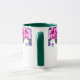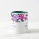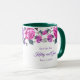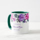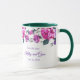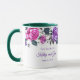 Esta taza floral tiene rosas púrpuras y rosadas con hojas verdes esmeralda marino alrededor del borde superior de la taza sobre un fondo blanco. Texto morado esperando que lo personalices. El interior de muestra mostrado es verde. Elige el color interior que se adapte a tu gusto. Personaliza esta taza o cómprala tal como está diseñada.