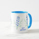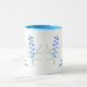 Una taza con imágenes de hermosas flores azules. El fondo, las imágenes y el texto se pueden peonalizar. Obra de arte original de W.B.