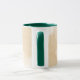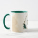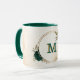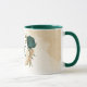 Hermosa taza de café con flores verde esmeralda y beige dorado con hojas verdes.