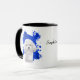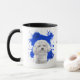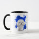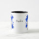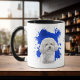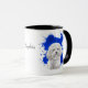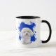 Un bonito retrato de color agua de una adorable frambuesa blanca de Bichon se destaca sobre un fondo de pintura abstracta azul brillante. La imagen está en dos lados de la taza, con su nombre u otro texto personalizado en negro entre ellos.