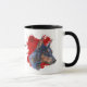 Un hermoso retrato de color agua de un Doberman Pinscher negro destaca sobre un fondo de pintura abstracta rojo brillante. La imagen está en dos lados de la taza, con su nombre u otro texto personalizado en negro entre ellos.