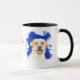 Un hermoso retrato de color de agua de un Labrador Recuperador amarillo se destaca sobre un fondo de pintura abstracta azul brillante. La imagen está en dos lados de la taza, con su nombre u otro texto personalizado en negro entre ellos.