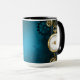 fondo turquesa, texturado, de vapor punk con bronce y oro, llave de plata y reloj. Estilo Steampunk.