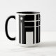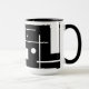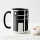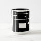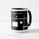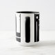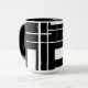 Esta taza de café blanca sobre arte abstracto negro está hecha con formas geométricas blancas sobre un fondo negro, creado por el artista Kirt Tisdale.