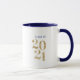 Esta taza de graduación fotográfica muestra flores de color azul y blanco en la parte delantera y Clase de 2021 en un falso purpurina de oro en la parte posterior. La parte delantera tiene un lugar para personalizar con un nombre sobre un pantano acuático. Hay un falso acento de confeti dorado cerca del nombre.