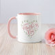 Mug cardíaca del Día de la Madre con dos fotos del corazón, nombres y mensaje personalizado. El diseño de la parte delantera es editable - usted puede elegir su propia combinación de colores. Atrás: hay marcos de fotos del corazón para 2 niños. Hazlo especial añadiendo sus nombres y un mensaje en la parte posterior. © Kimbellished, LLC
