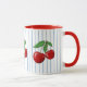 Pintura gráfica original de cerezas rojas jugosas y frescas sobre un fondo de rayas azules. Es genial con la cocina retro, vintage, rockabilly, de los años 40, 50, temas modernos de medio siglo. Huella divertida para cocina, dormitorio, artículos de baño o ropa linda. Artellus Artworks presenta PINTURAS ORIGINALES, GRÁFICOS y ARTWORK del artista. Derechos de autor de arte Artellus Artworks. No copiar.