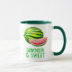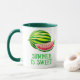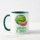 Mug in a whole watermelon accompanied by a juicy red slice dotted with black seeds. Below the fruit, bold green text reads “SUMMER IS SWEET,” evoking the refreshing, sugary delight of watermelon as a quintessential summer treat.