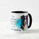 Un retrato de un bello perro collie de borde blanco y negro es la característica en dos lados de esta taza. Cada imagen se coloca sobre un fondo de salpicadura azul brillante. Entre las dos imágenes está el texto que describe a este compañero leal y altamente inteligente, con "el perro COLLIE BORDER" en negro en la parte inferior. Todo el texto se personaliza fácilmente para que puedas describir a tu propio amigo leal.