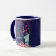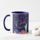Fuegos artificiales del 4 de julio con fuegos artificiales azules, rojos y blancos de la Estatua de la Libertad Mug y la bandera estadounidense ambientada en un fondo azul con la Estatua de la Libertad para celebrar el Día de la Independencia. Feliz 4 de julio, voltea la parte de atrás de nuestras vacaciones patrióticas de verano invitamos a ver una coincidencia hacia atrás. Elegante invitación para una barbacoa en el día del homenaje, cocina del 4 de julio, fiesta del día del trabajo o cualquier fiesta de temática patriota.