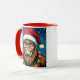 A funny Sasquatch personalized Christmas coffee mug with a comic book style pop art sasquatch smiling with a Santa and Christmas lights on.