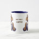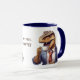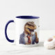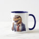 En esta graciosa taza para la oficina, un furioso T-Rex está vestido con un traje y corbata, y sostiene su taza de brea. El texto del centro dice: "Pero primero... CAFÉ". La imagen del dinosaurio se imprime dos veces en la taza, con el texto marrón entre las imágenes.