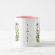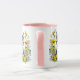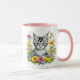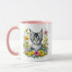Arte que representa a un adorable gato adorable y bonito gatito con manteles en tonos grises, rodeado de flores color amarillo bonito y rosa, todo de un estilo acuático. Agregar nombre en el área de personalización. Esta taza dice tía, pero puedes cambiarla por un nombre u otro miembro de la familia.