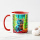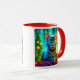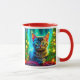 Los gatitos de doble cara, lindos y grises, sentados frente a la taza de café iluminada de árboles de Navidad.