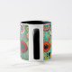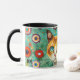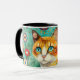 La imagen de esta taza única y colorida es un gato naranja jengibre con ojos azules brillantes. El cuadro es de estilo Klimt, con colores más azules, rojos y marrones verde azulados. Un lado inferior tiene un campo de texto donde puede agregar su nombre o monograma.