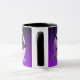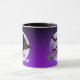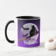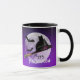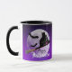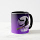 Esta taza de Halloween muestra un gato negro con un gorra brujo volando en la noche en una escoba de brujas rodeada de murciélagos frente a una luna llena y un texto que dice "Feliz Halloween".