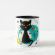 Ilustracion colorido de estilo abstracto de mediados de siglo con gato negro, estrellas negras y círculos coloridos decoración sobre fondo blanco