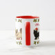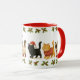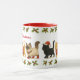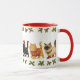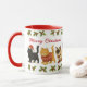 Esta taza con tema navideño presenta un adorable trío de gatos vestidos con ropa festiva. El gato negro lleva un sombrero de Santa, el atigrado naranja luce un suéter rojo y blanco de Fair Isle, y el ragdoll tiene un collar a cuadros con botitas rojas. El trío de gatos se ve especialmente lindo en Navidad. Se ha añadido acebo con bayas rojas para hacer esta taza aún más festiva. Compra esta encantadora taza como regalo de Navidad para cualquier amante de los gatos. ¡Es el regalo perfecto! Arte de IA diseñado por Susang6