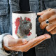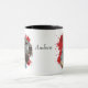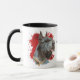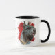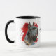 Un bonito retrato de color agua de un Schnauzer gigante destaca sobre un fondo de pintura abstracto rojo brillante. La imagen está en dos lados de la taza, con su nombre u otro texto personalizado en negro entre ellos.