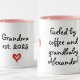 Cute mug for a (new) grandma, with message "Grandma est. (year) - Fueled by coffee and grandbaby (name)" as well as a playful little heart design. The text is fully customizable - change or delete. Celebrate the joy of becoming a grandma with this heartwarming mug. It makes the perfect gift for a new grandma. Whether it's for a baby announcement, a pregnancy reveal, her birthday, or just to make her smile, this mug is a daily reminder of her new favorite title - Grandma! Designed by Best Baby Gifts - given with love!