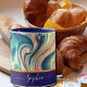Eleve su experiencia de café o té con esta elegante taza, adornada con hipnotizadores abstractos de fluidos fascinantes en ricos tonos azules y dorados. El elegante tipo de letra del guión con los elegantes swashes permite la personalización: ¡agrega un nombre para hacerlo único suyo! Una perfecta combinación de estética moderna y encanto artístico, esta taza es un regalo para quien aprecie la elegancia con un toque de individualidad. Ya sea para el hogar, la oficina o como un conservador especial, este impresionante diseño seguro que impresionará.