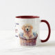 "Besos de cachorro Golden Retriever arreglan todo" declara esta taza para el dueño del Perro Golden Retriever. La imagen de cada lado es un retrato de un adorable cachorro dorado en una canasta de mimbre. Las imágenes y el texto se colocan sobre un fondo blanco salpicado de confeti dorado.