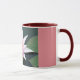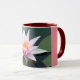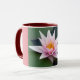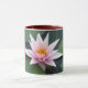 Una hermosa lila de agua sobre sus propias hojas en un lago. Sencillo, tranquilo y hermoso. Esta fotografía fue tomada en un día inestable en la época de floración del Waterlily. Ama sus pétalos delicados y, sin embargo, fuertes, mientras flota sin esfuerzo en el agua. Un regalo de bonito y un diseño individual en una taza práctica