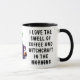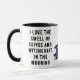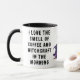 Divertido tema de Brujas Morado Verde y Negro Halloween Mug - el texto del Personalizable dice "Amo el olor del café y la brujería en la mañana" con un ilustracion acuarela de una taza de café brumosa completa con gorra de brujas morado y escoba voladora. Perfecto para los que aman todas las cosas de Halloween, brujas o solo quieren una taza divertida y divertida para la temporada de otoño.