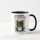 Si esta eres tú en la oficina la mayoría de los días, ¡necesitas esta taza de café! La imagen en dos lados es de un gato negro gruñón sosteniendo una taza de café humeante. El texto negro encima y debajo de la imagen dice "Shhhhhh... mi café y yo estamos teniendo un momento. Me ocuparé de ti más tarde". La imagen se coloca sobre un fondo retro de rayas verde azuladas y dorado. Toda la imagen y el texto están impresos en dos lados de la taza, con su monograma o nombre en negro en la parte central.